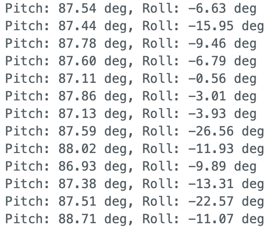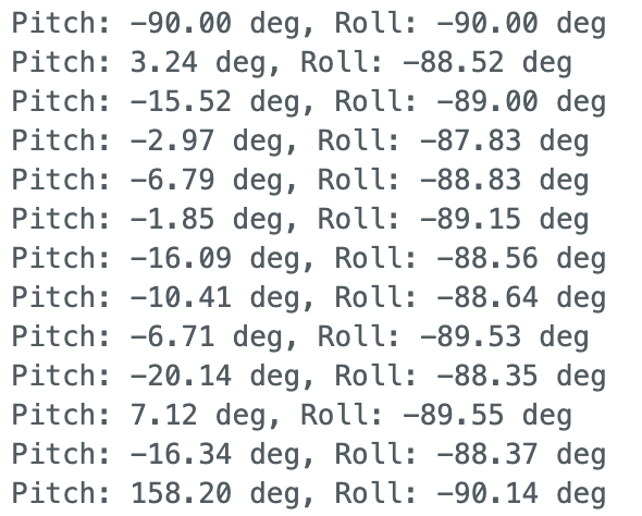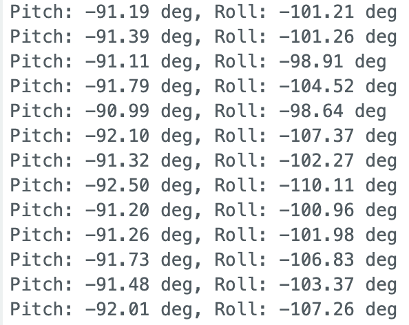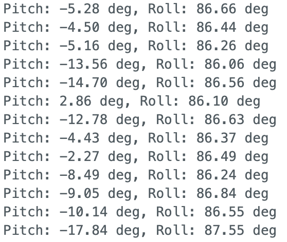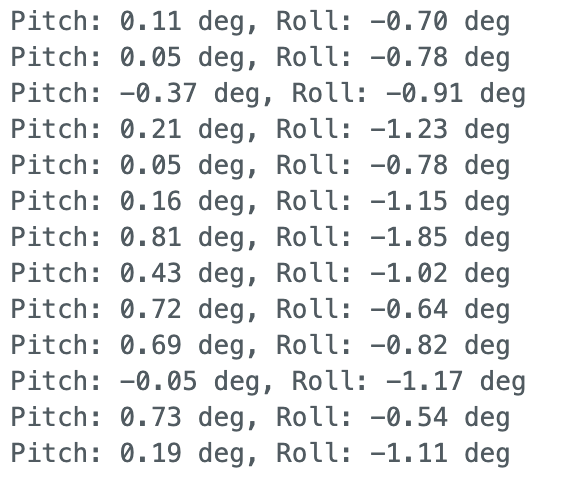 3 sets of data corresponding to gyroscope, accelerometer and magnetometer are printed. This screenshot was taken when the IMU was laid flat on the table, which corresponds to the near 0 values for a_x and a_y. The measured a_z value is approximately +1g, which is the upward normal force on the sensor when it is stationary on the table.